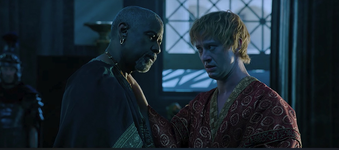 Denzel Washington’s character is introduced as an observer of the protagonist’s talent. He purchases the main character as a slave, intending to train him as a gladiator to make money. As the protagonist proves his skill in the arena, we learn that Washington’s character has ulterior motives tied to revenge and chaos within the Roman Empire.